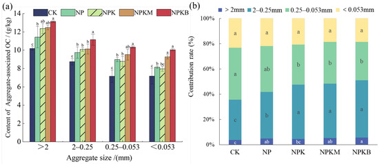 3.4.2. Soil Aggregate-Associated OC Content and Its Contribution Rate