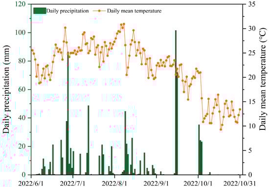 The experimental site is located at the National Agricultural Science Observation and Experimental Station, situated in Laiyang city (36.9° N, 120.7° E), Shandong Province. The climate of the region was characterized as semi-humid temperate continental monsoonal climate with an average temperature of 13.1 °C and an annual precipitation of 743.5 mm for the period 1993–2022. The meteorological data during the trial period are presented in Figure 1. The soil type is non-calcareous fluvo-aquic soil. Soil properties within 0–20 cm before the field experiment started in 1978 were as follows: soil organic carbon (SOC): 5.01 g kg−1; total nitrogen (TN): 0.60 g kg−1; total phosphorus (TP): 0.64 g kg−1; Olsen-P: 15.34 mg kg−1; available potassium (AK): 84.00 mg kg−1; and pH value (water–soil = 2.5:1): 6.80. At the start of the study in 2022, the soil properties within the 0–20 cm were as follows: SOC: 7.13 g kg−1; TN 0.67: g kg−1; Olsen-P: 16.84 mg kg−1; AK: 68.33 mg kg−1: and pH value (water–soil = 2.5:1): 6.88.