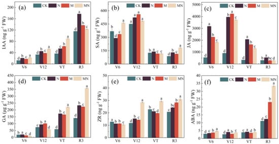 Effects of long-term fertilization on indole-3-acetic acid ((a), IAA), salicylic acid ((b), SA), jasmonic acid ((c), JA), gibberellins ((d), GA), zeatin riboside ((e), ZR), and abscisic acid ((f), ABA) in maize leaves at different growth stages. V6, six-leaf stage; V12, twelve-leaf stage; VT, silking stage; R3, grain filling stage. Different letters indicate significant differences among treatments at p < 0.05. CK, no fertilizer application; N, 276 kg N ha−1; M, 60,000 kg pig manure ha−1; MN, 60,000 kg pig manure +276 kg N ha−1.