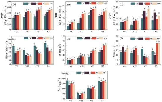 Effects of long-term fertilization on superoxide dismutase ((a), SOD), peroxidase ((b), POD), catalase ((c), CAT), malondialdehyde ((d), MDA), soluble sugar ((e), SS), soluble protein ((f), Spr), and proline ((g), Pro) in maize leaves at different growth stages. V6, six-leaf stage; V12, twelve-leaf stage; VT, silking stage; R3, grain filling stage. Different letters indicate significant differences among treatments at p < 0.05. CK, no fertilizer application; N, 276 kg N ha−1; M, 60,000 kg pig manure ha−1; MN, 60,000 kg pig manure +276 kg N ha−1.