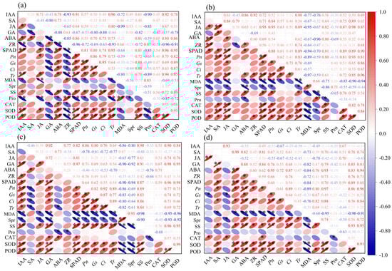 Pearson correlation analysis of various indicators at the maize six-leaf ((a), V6), twelve-leaf ((b), V12), silking ((c), VT), and grain filling ((d), R3) stages after long-term fertilization. Red and blue elliptical shapes with different directions represent positive and negative effects, the different shapes represent the strength of the correlation. ** and * represent p < 0.01 and p < 0.05, respectively. IAA, Indole-3-acetic acid; SA, salicylic acid; JA, jasmonic acid; GA, gibberellins; ABA, abscisic acid; ZR, zeatin riboside; Pn, photosynthetic rate; Gs, stomatal conductance; Ci, intercellular CO2 concentration; Tr, transpiration rate; MDA, malondialdehyde; Spr, soluble protein; SS, soluble sugar; Pro, proline; CAT, catalase; SOD, superoxide dismutase; POD, peroxidase.