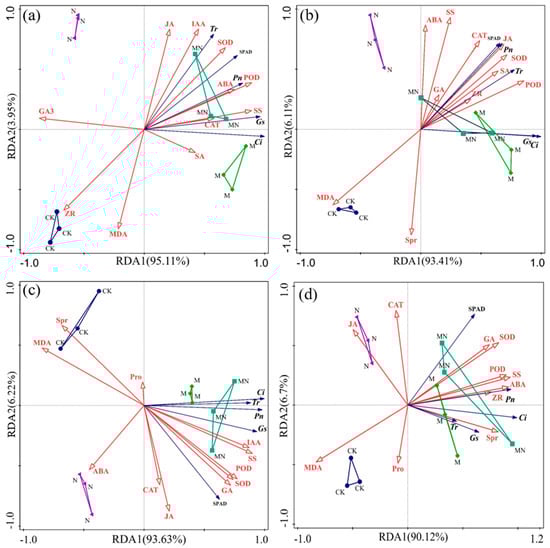 Redundancy (RDA) analysis of various indicators with photosynthetic characteristics at the maize six-leaf ((a), V6), twelve-leaf ((b), V12), silking ((c), VT), and grain filling ((d), R3) stages after long-term fertilization. Red and blue arrows represent the dependent and independent variable, the length of arrows indicate the degree of correlation between indexes and sample distribution. The dashed lines represent the main directions of data variation. IAA, Indole-3-acetic acid; SA, salicylic acid; JA, jasmonic acid; GA, gibberellins; ABA, abscisic acid; ZR, zeatin riboside; Pn, photosynthetic rate; Gs, stomatal conductance; Ci, intercellular CO2 concentration; Tr, transpiration rate; MDA, malondialdehyde; Spr, soluble protein; SS, soluble sugar; Pro, proline; CAT, catalase; SOD, superoxide dismutase; POD, peroxidase. CK, no fertilizer application; N, 276 kg N ha−1; M, 60,000 kg pig manure ha−1; MN, 60,000 kg pig manure +276 kg N ha−1.