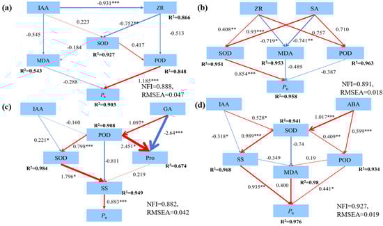 Partial least-squares structural equation model (PLS-SEM) of the dominant physiological driving process regulating photosynthesis at the maize six-leaf ((a), V6), twelve-leaf ((b), V12), silking ((c), VT), and grain filling ((d), R3) stages after long-term fertilization. Red and blue arrows represent positive and negative effects, the thickness of arrows represent the strength of the correlation. Path coefficients and the determination coefficient (R2) are calculated through 5000 bootstrap resampling iterations. Numbers on arrows are standardized path coefficients, ***, ** and * represent p < 0.001, p < 0.01 and p < 0.05, respectively. NFI, Normed Fit Index; SRMR, standardized root mean square residual; IAA, Indole-3-acetic acid; SA, salicylic acid; JA, jasmonic acid; GA, gibberellins; ABA, abscisic acid; ZR, zeatin riboside; Pn, photosynthetic rate; Gs, stomatal conductance; Ci, intercellular CO2 concentration; Tr, transpiration rate; MDA, malondialdehyde; Spr, soluble protein; SS, soluble sugar; Pro, proline; CAT, catalase; SOD, superoxide dismutase; POD, peroxidase.
