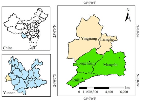 The study stations were conducted in Mangshi (24°4′ N, 98°59′ E), Ruili (24°1′ N, 97°85′ E), and Longchuan (24°2′ N, 97°79′ E), located in the Dehong Dai and Jingpo Autonomous Prefecture, Yunnan Province, at an elevation of 778–961 m. The region has an average annual temperature ranging from 15.9 °C to 27.7 °C, an average annual sunshine duration of 2252.9 h, and annual rainfall between 1221.1 mm and 1546.5 mm. The study area experiences an uneven seasonal rainfall distribution, typically entering the rainy season after mid-May, with rainfall between May and August reaching 1297.9 mm, accounting for 77.4% of the total annual precipitation. The region belongs to a South Asian subtropical monsoon climate zone characterized by abundant heat, long sunshine hours, and small annual temperature variations. Its main soil type is lateritic red soil, with soil organic matter, available nitrogen, available potassium, and available phosphorus contents of 2.7 g/kg, 153.3 mg/kg, 158.2 mg/kg, and 56.3 mg/kg, respectively (Figure 1).