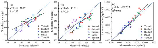 Comparison of measured and simulated values for days from sowing to flowering (a), days from sowing to maturity (b), and grain yield (c).