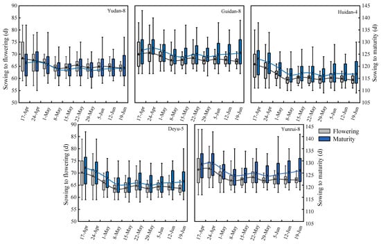 The duration of days from sowing to flowering and maturity for maize sown on various dates. Note: each box plot is based on 13 years of meteorological data to simulate the growth period. The upper and lower limits of each box are the upper and lower quartiles of the data, respectively. ▲ represents the average of the data.