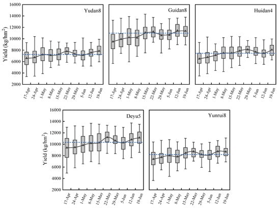Prediction results of maize yield using DSSAT model on different planting dates of 5 maize cultivars from 2012 to 2023. Note: the blue dashed line represents the average yield for all sowing periods in all years. ▲ represents the average of the data.