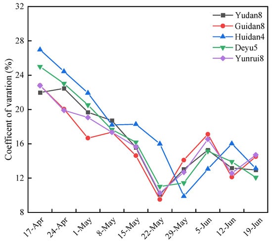 Using meteorological data from Longchuan, Ruili, and Mangshi from 2012 to 2023, the maize yields were simulated for 10 sowing dates between 17 April and 19 June. The average maize yield ranged from 7873.25 to 9395.33 kg/hm2 (Figure 4). Among the cultivars, GD-4 and DY-5 consistently exhibited significantly higher yields across all sowing dates compared with YD-8, HD-8, and YR-8. The yield trends for the five maize cultivars generally aligned with the changes in the sowing dates, showing an overall increasing trend with delayed sowing. The early increase in yield was pronounced, stabilizing later, with the highest yields occurring between 15 May and 29 May. When sowing occurred before 15 May, the average yield decreased by approximately 3% for each 7-day advance in the sowing date. The lowest yield occurred with the 17 April sowing, which also had the highest annual coefficient of variation (CV). HD-8 exhibited a CV of 26.97%. The average yield peaked for YD-8, GD-4, DY-5, and YR-8 when sown on 22 May, with the lowest annual CVs of 10.1%, 9.52%, 11.03%, and 10.26%, respectively (Figure 5). For HD-8, the highest yield occurred on 29 May, with the lowest CV of 9.88%. After June, the yields initially decreased and then increased. By June 5, the average yield had dropped to 7,120.89 kg/hm2. Following 5 June, the average yield increased by 4% for each 7-day delay in sowing. However, the average yield for the 19 June sowing was still 189.57 kg/hm2 lower than that for the 22 May sowing.