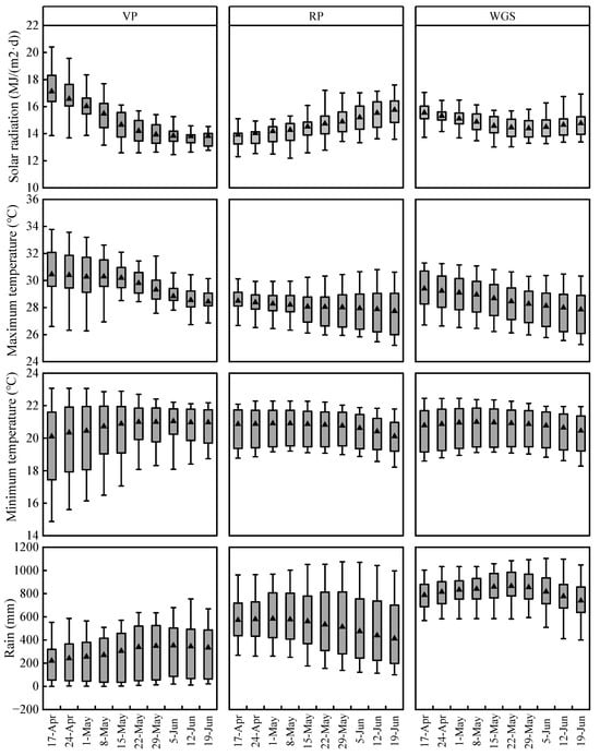 Box plot distribution of solar radiation, maximum temperature, minimum temperature, and total rainfall during vegetative period, reproductive period, and whole growth period of maize on each planting date from 2012 to 2023. ▲ represents the average of the data.