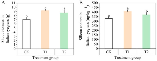 The application of silica supplement significantly increased the shoot biomass of Italian ryegrass and increased the deposition of silica in the above-ground portion of Italian ryegrass (p < 0.05) (Figure 1). Compared with the control, the shoot biomass of Italian ryegrass in T1 and T2 groups was increased by 30.26% and 22.61%, and the silicon content was increased by 23.05% and 12.43%, respectively.
