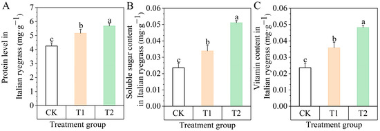 Both T1 and T2 treatments had a significant promotion effect on the content of protein and osmolytes in Italian ryegrass compared to the control group (Figure 2). In particular, the content of protein, soluble sugar, and vitamins increased by 33.62%, 116.66%, and 104.45%, respectively, in the T2 treatment group.