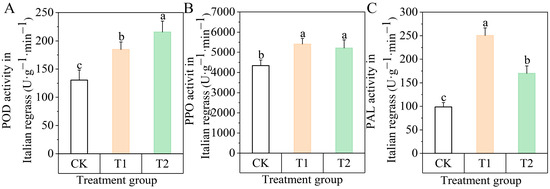 Compared with the control group, both T1 and T2 treatments significantly increased the activity of defense enzymes in Italian ryegrass (p < 0.05) (Figure 3). POD activity was higher in the T2 treatment group, rising by 65.18% (Figure 3A), while PAL activity was higher in the T1 treatment group, rising by 154.34%, and in the T2 group, rising by 72.72% (Figure 3C). The PPO activity was similar in the T1 and T2 treatment groups with an increase of 24.76% and 20.19%, respectively (Figure 3B).