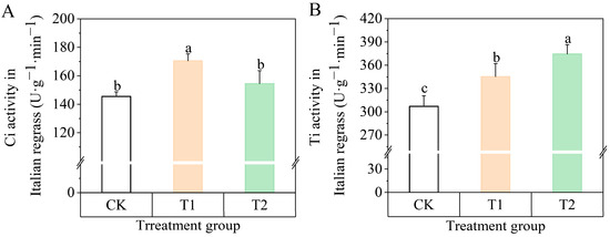 Although both T1 and T2 treatments increased Ci and Ti activity, Ci activity reached a significant level in the T1 group with a 17.22% increase compared to the control (p < 0.05); Ti activity was higher in the T2 treatment group with a 22.02% increase (Figure 5).