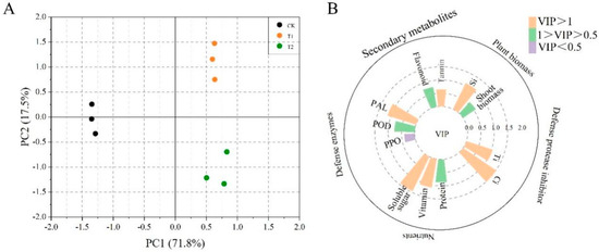 Principal component analysis (PCA) can reduce and simplify complex data while retaining the maximum amount of original content, while at the same time, using a few principal components to reveal the internal structure among multiple variables to form a new composite index. As seen in the PCA score plot, the principal components (PC1 and PC2) explain close to about 90% (71.8% and 17.5%) of the variance. The data from the silicon treatment group were well separated from the control group, but the degree of separation between the two treatment groups was low (Figure 6A). The VIP were used to further clarify the contribution of each physiological parameter to the integrated silicon-induced changes in Italian ryegrass. Silicon content, PAL, and protease inhibitors contributed the most (VIP > 1), followed by aboveground biomass, POD, secondary metabolites, and proteins (0.5 < VIP < 1), while PPO contributed the least (VIP < 0.5) (Figure 6B).