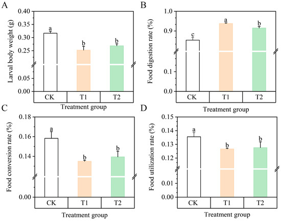 Fall armyworm eggs were disinfected by soaking in a solution of approximately (Sinopharm Group Chemical reagent Co., Ltd., Shanghai, China) 10% formaldehyde for 40 min. The eggs were then incubated at a temperature of 25 °C ± 1 °C and a humidity of about 40%. After the larvae first hatched, they were fed with pasture corresponding to the treatment, and thereafter fresh pasture was changed daily to ensure sufficient food for the larvae. When the larvae reached the 4th instar, 10 heads were used as a replicate to measure weight and food utilization changes, and three replicates were set up for each treatment (there was no significant difference between T1 and T2 in terms of shoot biomass) [6].