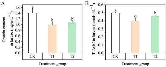Both silicate treatments significantly reduced larval protein accumulation and T-AOC compared to the control (p < 0.05), but the T1 treatment inhibited T-AOC more strongly, with an inhibition rate of 19.86% (Figure 8).