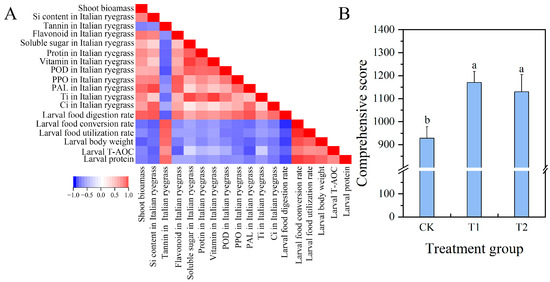 The above results suggest that several physiological indicators of Italian ryegrass may be associated with food utilization, antioxidant capacity, protein, and body weight accumulation in fall armyworms. However, even though different silicates affected different indicators of insect resistance separately, such as the significant increase in Ci activity in the T1 treatment and the significant increase in Ti activity in the T2 group, it was not possible to represent the combined level of Italian ryegrass resistance by changes in individual indicators (Figure 5). Therefore, in this study, the insect resistance of Italian ryegrass treated with silicon was evaluated comprehensively by calculating the composite score. The results showed similar combined effects of T1 and T2 treatments on Italian ryegrass, but both treatments formed a significant difference (p < 0.05) from the control, indicating that silicon application altered the insect resistance of Italian ryegrass (Figure 9B).