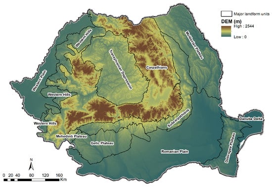 According to Corine Land Cover 2018 data [38], the agricultural land of Romania totals 133,295 km2, including arable land, permanent crops (vineyards, fruit trees), pastures, and heterogeneous agricultural areas. Most of the agricultural land is found in the lower elevation areas, in the Romanian Plain (39,196.8 km2), the Moldavian Plateau (16,917.7 km2), and the Transylvanian Depression (16,797.0 km2) (Table 2). The non-agricultural area covers a surface of about 99,768 km2.