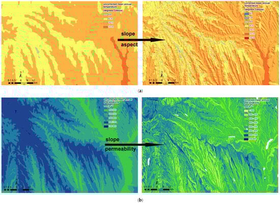 We applied these corrections by assigning numerical codes of different magnitude to temperature/precipitation, slope, aspect, and permeability classes and by adding them to achieve unique combinations, to which we further assigned the corrected temperature and precipitation values. Figure 3 shows the effect of these corrections compared to the uncorrected (elevation) spatial models.