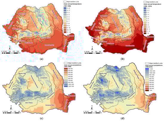 In the case of the mean annual precipitations, we noticed a general slight increase in the values across the country (Figure 4c,d), from an average of 631.8 mm yr−1 to 700.6 mm yr−1 (Table 1), which is the highest in the Carpathians area (118.8 mm yr−1). Among the lower elevation areas, dominated by agricultural lands, the highest precipitation increase is found in the Western Hills (79.2 mm yr−1) and Dobrogea Plateau (74.2 mm yr−1).