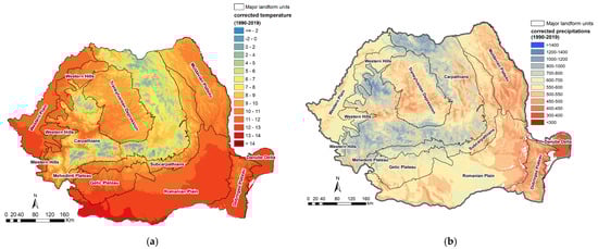 Climate factors: corrected mean annual temperatures (a) and precipitations (b) for 1990–2019 period.