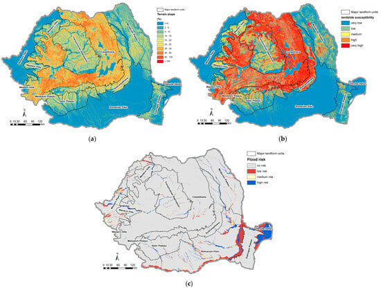Terrain factors: slope (a), landslide susceptibility (b) and flood risk (c).