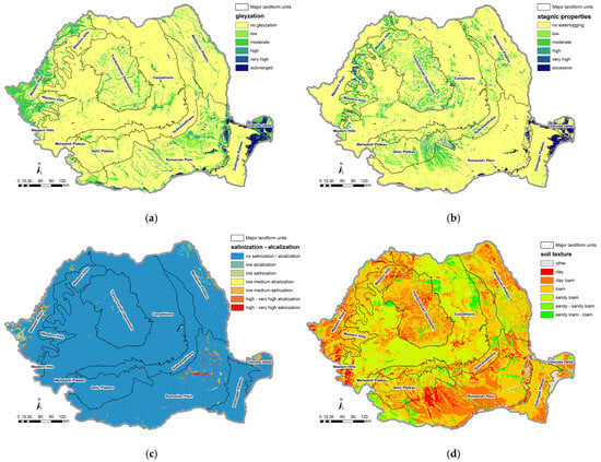 The soil factor category includes most of the suitability factors. The attribute table data provided by the soil map of Romania [30] was used to map soil gleization, stagnic properties, salinization/alkalization, and edaphic volume based on soil types.