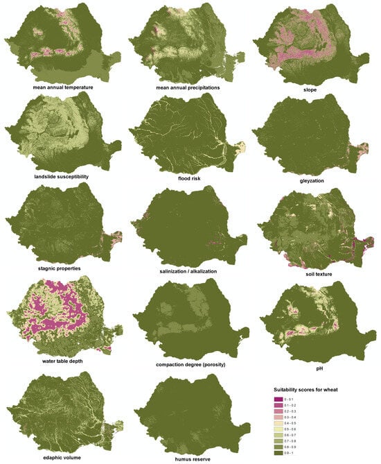 According to the methodology [20], the suitability of the factors is expressed by means of suitability scores, ranging from 0 (no suitability) to 1 (very suitable, no restrictions). These scores differ according to specific crops. In our study, we considered the 5 main crops of Romania, namely winter wheat, maize, sunflower, potato, and vine for wine. The suitability factors were recorded in the attribute table of classified raster layers representing the suitability factors, and then exported as raster maps. The assessment of the suitability factor is more complicated in the case of several factors because they are evaluated in relation to other factors: precipitations are evaluated in relation to temperature; texture in relation to porosity; water table depth in relation to precipitations and soil texture; porosity in relation to texture; soil reaction in relation to base saturation degree; edaphic volume in relation to precipitations; and humus reserve in relation to texture. In these situations, we had to record multiple suitability scores, export them all as raster layers and integrate them conditionally in order to obtain the factor suitability. For instance, in the case of pH, which is evaluated in relation to base saturation, we recorded two columns of scores in the attribute table of the classified pH map, exported them as two maps, corresponding to base saturations under 55% and over 55%, respectively, then integrated the maps conditionally (if base saturation is <55% take the values from one map, otherwise from the other map) in order to achieve the pH suitability map.