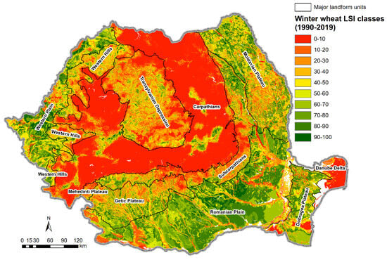 The least suitable areas for winter wheat are found obviously in the mountain area (mean LSI values is 21.9 and modal class is X, with a share of 47.6%), due mainly to climatic and terrain restrictions, the Danube Delta (mean LSI values is 18.2 and modal class is VIII, with a share of 26.1%), due mainly to water-related problems (gleization, stagnic properties, and flooding). Also, less suitable for winter wheat is the Transylvanian Depression, which has a mean LSI value of 30.2 and a modal suitability class of VIII with a share of 20.7%.