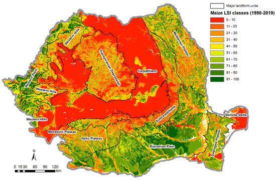 In the case of maize, our analysis shows that the highest suitability is specific also to the plain areas (Romanian Plain, with a mean LSI of 69.3 and a modal class of III with a share of 28.1%; Western Plain, with a mean LSI of 65.4 and a modal class of II with a share of 19.9%) (Table 3, Figure 10). Also, suitable areas for maize are found within Dobrogea Plateau (mean LSI of 58 and modal class III with 37.4%) and Getic Plateau (mean LSI of 53.3 and modal class II with 15.1%). The least suitable terrains for maize, besides the Carpathians and the Danube Delta, are found in the Transylvanian Depression (mean LSI of 27.3 and modal class X with 22.2%). In the Subcarpathians, the situation is varied. While the Curvature Subcarpathians are generally unsuitable for maize, there are areas suitable in the northern Moldavian Subcarpathians and Getic Subcarpathians, which cause the apparent contradiction between the modal class IX (15.9%) and the higher mean LSI (41.4).