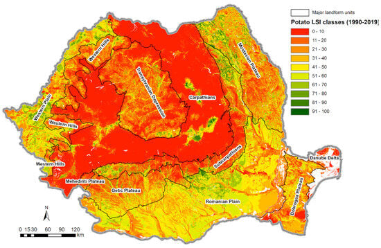 In the case of potato, the statistics computed for the major landform units are not so relevant. That is because potatoes are a less widespread crop, with more specific ecological conditions, which means that suitable lands cover quite small areas within the major landform units. As shown in Table 5, the overall land suitability for potatoes is reduced in Romania, which is true at the level of the major landform units, where the modal classes are either unsuitable or marginally suitable. As shown in the map in Figure 12, within these large landform units, there are areas suitable for potatoes, like the northern Subcarpathians, the north-west of the Moldavian Plateau (Suceava Plateau), the intra-mountainous depressions, or parts of the Western Plain.