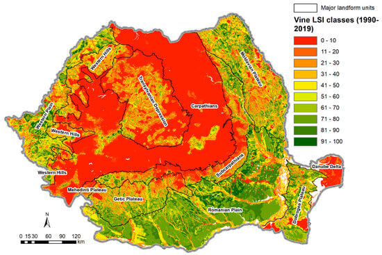 This interpretation is partially valid for vine. Again, the statistics extracted for the major landform units are not so relevant. Table 6 shows that there is higher suitability in plateau areas such as the Getic and the Dobrogea Plateaus, as well as in the Western and Romanian Plains. However, in the plain areas, many suitable lands for vines are situated adjacent the hilly areas (Subcarpathians, Western Hills). For this reason, the plain areas appear more suitable and the hilly areas less suitable, when many suitable lands for vines are found in the Subcarpathians, especially at their curvature sector. The map of vine suitability (Figure 13) shows that the most suitable lands for vines are found at the contact between the Subcarpathians and the Romania Plain, on piedmont deposits. Locally, other suitable areas are found in the Dobrogea Plateau, Moldavian Plateau, and Western Plain.