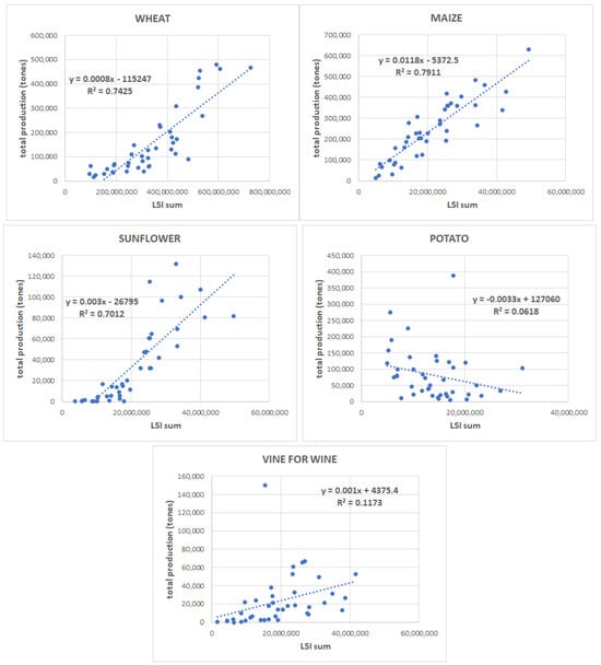 Correlations between the total crop production (1990–2019 averages) and sum of the LSI values extracted for Romanian counties (NUTS 3 level).