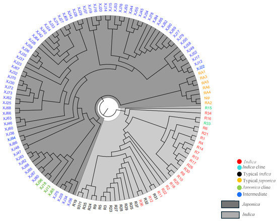 where Xii represents the homozygous indica rice genotype (II), Xjj represents the homozygous japonica rice genotype (JJ), Xij represents the heterozygous genotype combining indica and japonica rice (IJ), and N represents the number of InDel primer pairs used. The classification criteria proposed by Lu Baorong et al. [39] were applied to determine the indica or japonica nature of the tested materials (Table 3).