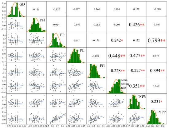 Correlation between the genetic distance and heterosis. * and ** mean significance at the 0.05 and 0.01 probability levels, respectively. PH: the plant height; EP: the effective panicle number per plant; PL: the panicle length; FG: the filled grain number per panicle; TGW: 1000-grain weight; YPP: yield per plant.