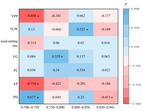 To further explore the relationship between the GD and heterosis, a correlation analysis between different ranges of the GD and heterosis was conducted (Figure 5). The GDs between the parents used in this study ranged from 0.706 to 0.941. Due to only three samples in the range of 0.900 to 0.941, this range was merged with the range of 0.850 to 0.941. In the range of 0.706 to 0.750, the GD was significantly positively correlated with the PH and significantly negatively correlated with the EP and YPP. This indicates that within this range, as the GD increases, the PH increases, and the EP and YPP decrease. In the range of 0.750 to 0.800, the GD was significantly positively correlated with the FG, indicating that within this range, as the GD increases, the number of FG increases. In the range of 0.800 to 0.850, the GD was significantly positively correlated with the TGW, indicating that within this range, as the GD increases, the TGW increases. In the range of 0.850 to 0.941, the GD was significantly negatively correlated with the PH, indicating that within this range, as the GD increases, the PH decreases. These results suggest that the correlation between the GD and heterosis for various traits differs within different ranges of the GD.