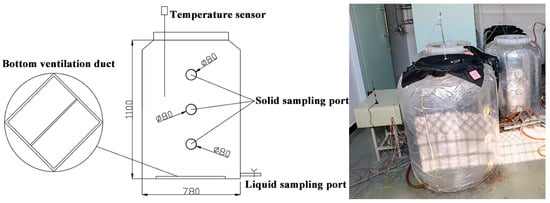 The composting test was carried out in a self-made aerobic fermentation device, a 500 L polyethylene (PE) tank (Cixi Hongsheng Plastic Container Co., Ltd., Cixi, China) with bottom ventilation ducts (Figure 1). The outer of the tank was wrapped with polyurethane insulation and a high-density polyethylene jacket outer sleeve. The experiments were conducted with four treatments, as shown in Table 1. The three-layer membranes (polyester fiber-e-PTFE-polyester fiber (Qingdao Zhiteng Technology Co., Ltd., Qingdao, China)) were included in this work.