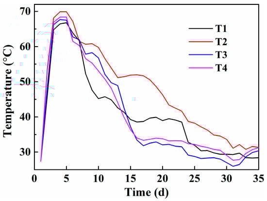 The initial temperature and humidity were 27.4 °C and 62.8%, respectively. The variation in temperature of the four treatments during the composting process is shown in Figure 2. All treatments reached a temperature higher than 65 °C in 5 days, and except T1, other treatments could keep the temperature above 55 °C around 10 days. Especially for the T2, the temperature can still be maintained above 50 degrees during the fermentation for 20 days. The total fermentation period was 35 days. After the fermentation process, the compost product was poured out of the tank and dried naturally outdoors before being crushed to 2 mm for subsequent testing.