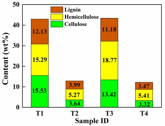 The principal components (cellulose, hemicellulose, and lignin) of samples were investigated according to the Van Soest washing method [13]. One gram of sample through a 40-mesh screen was boiled in neutral detergent, the residue was neutral detergent fiber (NDF, %). Another 1 g sample was washed with acid detergent, the residue was acid detergent fiber (ADF, %). Then, the ADF was washed with sulfuric acid, the residue (R1, %) was lignin and silicate. R1 was then ashed in the furnace, the residue (R2, %) was silicate. In this test, all residues were washed to neutral and oven-dried to a constant weight. Hence, hemicellulose (%) = NDF − ADF; cellulose (%) = ADF − R1; lignin (%) = R1 − R2.
