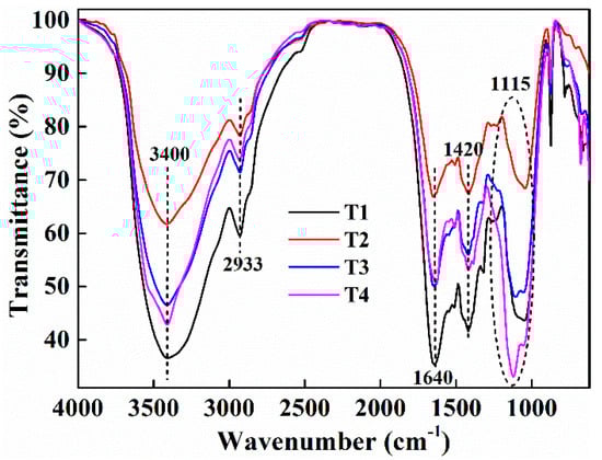 The FTIR spectra of different composts are represented in Figure 4. The main absorption peaks were as follow: a broad band at 3400 cm−1 is the O-H stretching vibration of alcohols, phenols, and organic acids; the peak locates at 2933 cm−1 is attributed to the C-H stretching vibration of aliphatic methyl, methylene, and methine; the peak at 1640 cm−1 may be assigned to C=C and C=O stretching of amide groups and quinonic C=O and/or C=O of H-bonded conjugated ketones; 1420 cm−1 peak is indicative of the C-H bending of aromatic ether; the peak at 1115 cm−1 is the stretching vibration of C-O bonds in either ether or alcohol compounds [9,19,20]. FTIR spectra of four samples exhibit similar areas of absorbance through the sharpness of peaks varied from each other. It is indicated that the types of function groups of four samples were almost the same, but due to the different composting process, the conversion process of organic matter was different, so as the content of its functional groups. Hence, the intensities ratios of the above absorption peaks of different treatments will be more helpful in understanding the conversion of composts.