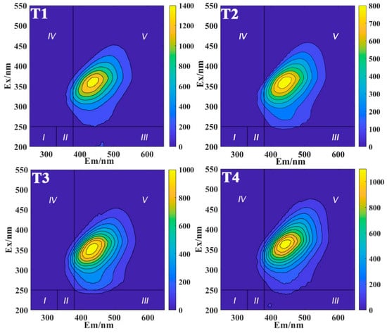 Fluorescent components of different composts were analyzed using fluorescence regional integration (FRI), which can usually be divided into five regions: aromatic proteins such as tyrosine (region I), aromatic proteins such as tryptophan (region II), fulvic acid-like substances (region III), soluble microbial byproduct-like substances (region IV), and humic acid-like substances (region V) [24]. The 3D-EEM fluorescence spectra of different composts are shown in Figure 5 and the proportions of five regions are listed in Table 3. In general, the ratio Ph/Pp is used to evaluate the stability of composts. Ph represents the sum of the proportions of region III+region V, which is the proportion of humic substances; Pp represents the sum of the proportions of region I+region II+region IV, which is the proportion of protein-like substances. The higher the value of Ph/Pp, the worse the biodegradability of the corresponding compost, that is, the more stable it is [25]. It can be observed that membrane-covered composts (T2 and T4) had higher Ph/Pp than non-covered samples, the order followed: T2 > T4 > T3 > T1. In addition, the ratio of humic acid content to fulvic acid content (PV/PIII) has been reported as a reliable parameter to evaluate compost maturity [26]. The order of the maturity degree of composts was the same as that of stability degree. It could prove that the higher maturity degree, the more stable. It can be explained that membrane-covered composting had created a “closed” environment for raw materials. During the ventilation process, raw materials could “breathe” more effectively and accelerate the degradation process than non-covered environments. On the other hand, the addition of superphosphate could accelerate the fermentation process in the open-air environment, but under the membrane covering condition, the addition of superphosphate slightly slowed down the fermentation process. The reason for this phenomenon might be that the addition of superphosphate can increase the compost temperature and improve the compost maturity. However, under the membrane-covered condition, the compost temperature rose relatively quickly, and the addition of superphosphate may cause the compost temperature to be too high and play a slight inhibitory effect.
