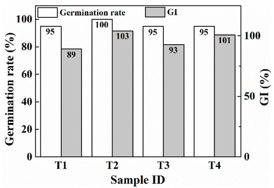 The GI value can be used to evaluate the compost maturity, and it is also an indicator that reflects the phytotoxicity in the substrate for the seeds. GI value under 50%, between 50 and 80%, and above 80% suggest high phytotoxicity, moderate phytotoxicity and no phytotoxicity, respectively. When GI exceeds 100%, the material can be considered as a phyto-nutrient or phyto-stimulant [31,32]. According to Figure 6, all samples exhibited higher germination rates (≥95%) and GI value (>80%), especially the GI value of T2 and T4 more than 100%. It is consistent with the above analysis that T2 and T4 had higher maturity. The results showed that it has a high feasibility that using compost as the seedling substrate.
