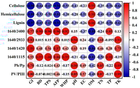 The relationship between the performance index of composts and lignocellulose components, FTIR and fluorescence parameters was identified using Pearson correlation analysis (Figure 7). It is worth noting that the lignocellulose components were only positively correlated with OM, and negatively correlated with all other properties. The lignocellulose components had significant positive correlation (correlation coefficient > 0.7) with OM, and significant negative correlation (correlation coefficient < −0.7) with GI and AFP. Lower lignocellulose components represent a higher biodegradation rate and thus lower OM. Higher GI is more likely to occur in compost with higher degradation rate.