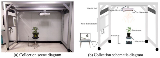 In this experiment, the data of the tomato canopy were acquired at four important growth stages, including the initial flowering stage, florescence stage, primary fruit stage, and ripening stage. A multispectral plant 3D laser scanning meter (Plant Eye F500, Heerlen, The Netherlands) was used for the data acquisition platform. The platform consists of a 3D laser scanner, a laptop, an electric slide, and a power distribution device. The Plant Eye F500 scanner is equipped with high-precision 3D laser scanning technology and multi-spectral sensors to support real-time data acquisition, processing, and analysis. The operating system was Windows 11, and the hardware configuration was equipped with an AMD Ryzen 75800H processor (model:75800H, Santa Clara, CA, USA), 16 GB of RAM (model: Samsung M378A2K43BB1-CRCD0, Pyeongtaek, Republic of Korea), and an integrated Radeon Graphics (model: Vega, Santa Clara, CA, USA). Python program language (version: 3.8.10) and Matlab software (version: R2023a) were used as the development tool. Data collection was carried out indoors under natural light. The procedure was divided into three steps. First, the multispectral plant 3D laser scanner was switched on and connected to its internal network via a laptop. Then, the embedded HortControl software (version: 3.8) was used to carry out the experiment. The length, width and height of the scanning range was set at 1.5 m × 0.75 m × 1 m to ensure the quality of tomato plant data acquisition. Finally, the tomato plant to be scanned was placed on a lifting table, and the 3D point cloud data of the plant was captured by scanning it vertically with the scanner moving along a sliding device. The height of the lift table was fixed at 45 cm, and the scanner was 140 cm from the height of the lift table. The pot height of tomato planting was 23 cm. The schematic diagram of the experimental data acquisition platform is shown in Figure 2.