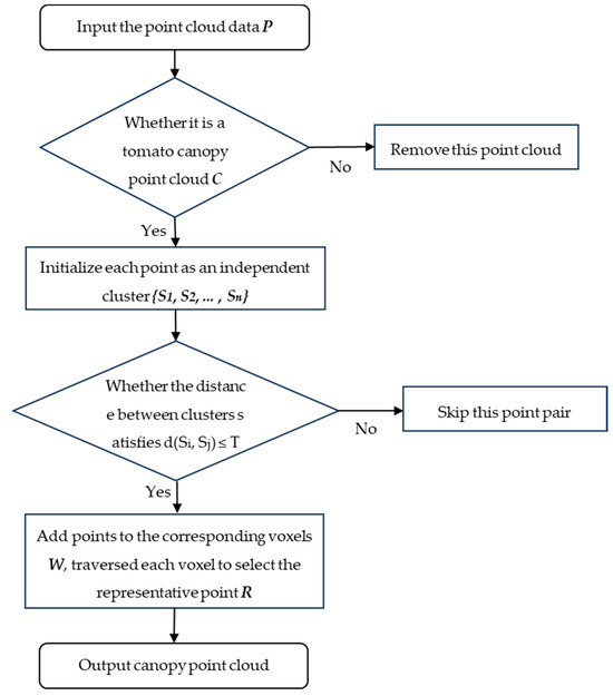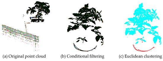 Based on a set conditional judgement, the principle of conditional filtering was to decide whether to keep or remove certain points in the filtering process (see Equation (1)). Removing useless background information resulted in clearer tomato pots, thus improving the quality and accuracy of point cloud data [17].