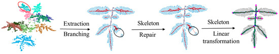 Third, the K-nearest neighbors of each point in the contracted point set N were found to calculate the Laplacian coordinates. The Laplacian contraction operation was used to contract N into a zero-volume point cloud set M. Then, the farthest distance sampling method was used to sample from M to obtain a set of skeleton vertices U. All neighboring skeleton vertices in U were connected to generate the set of edges g. Redundant edges were removed from the set of edges g using the edge collapse operation to form the final set of edges G [21]. The undirected graph H = (U,G), represented by the set of skeleton vertices U and the set of edges E, was the proposed branching skeleton.