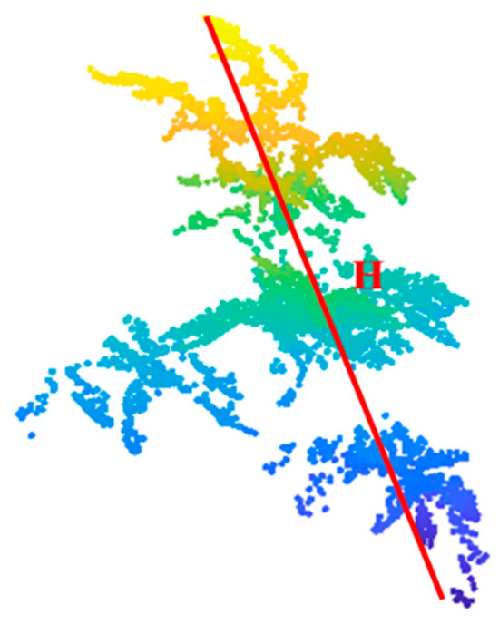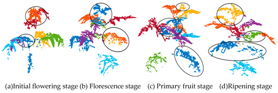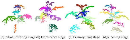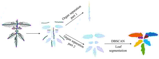 - The separated leaf point cloud was segmented into individual leaves using the DBSCAN clustering segmentation algorithm [25]. The effect of leaf recognition is shown in Figure 7.