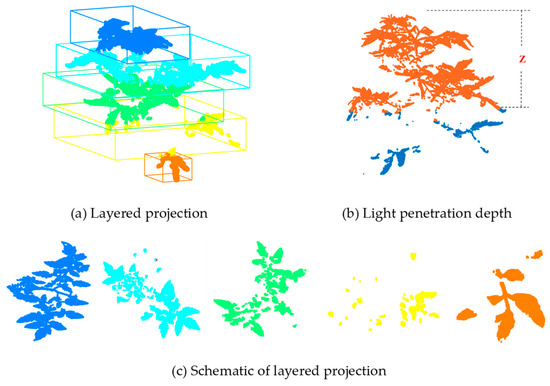 As one of the most important vegetable varieties, tomato ranks first in the world in terms of export volume and value, and has an important economic status, accounting for about 30 percent of the world’s total planting area [1]. Plant phenotypes are the characteristics and traits that can visually reflect the growth status of a plant produced by the interaction between genes and the environment [2]. The analysis of plant phenotypic traits is closely related to breeding fine varieties [3]. Therefore, it is important to acquire the phenotypic traits of tomato plants. However, the measurements of phenotypic traits are highly influenced by factors including personnel, environment, and equipment, which greatly limits the efficiency of large-scale genetic breeding screening [4]. Traditional phenotypic traits are generally measured manually, which is time-consuming, subjective, and often destructive to the plant [5]. Although 2D image processing has certain advantages in extracting plant phenotypic traits due to its low cost and high speed [6], when dealing with single-view crop images, it is often unsuitable to comprehensively obtain plant canopy information due to problems such as canopy occlusion and leaf adherence, thus affecting the accuracy of measurements. In contrast, 3D imaging technology can capture the 3D structure of plants through multi-view data, effectively avoiding the occlusion problem and providing more comprehensive and accurate canopy information [7]. The 3D point clouds allow for a better understanding of the canopy structure, and provide the feasibility of calculating phenotypic traits that are difficult to measure manually, such as leaf area, projected area, digital biomass, and light penetration depth. Therefore, the development of automated, efficient, and non-invasive 3D phenotypic traits’ measurements is essential to promote breeding process for the tomato plant [8,9].