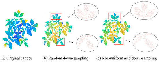 There were still a large number of redundant point clouds in the canopy area after canopy extraction. We used a non-uniform grid down-sampling method for point cloud streamlining. Non-uniform mesh down-sampling preserves features and reduces the number of points by using an irregular mesh in the 3D point cloud. The principle is to determine the size of the desired 3D spatial voxel depending on the position in each point , and determine the voxel to which it belongs. For each voxel , select representative points, keep the selected points, and discard the remaining points, thereby generating the point cloud data after down-sampling. The implementation of this step not only improved the efficiency of data processing, but also laid the foundation for the subsequent processing stages.