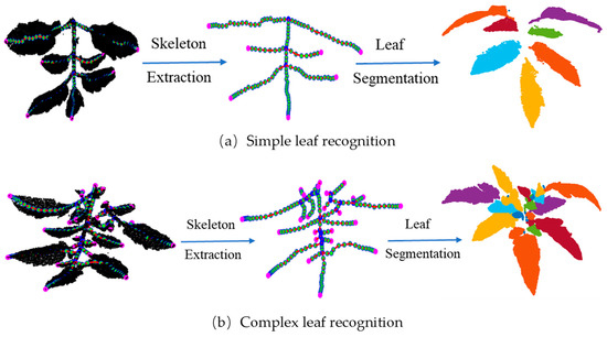 Figure 17 shows the results of leaf recognition, which were more accurate for tomato leaves, whereby the removal of other structures that were not part of the leaf could better prevent computational errors. The method has high accuracy for the simple branch and leaf separation at the initial stage (Figure 17a). For the later stage, the branch and leaf growth were more complex (Figure 17b), and the leaves were more compact with closed skeleton connection, which had less impact on the leaf recognition method in this study. The results of leaf recognition are shown in Table 3.